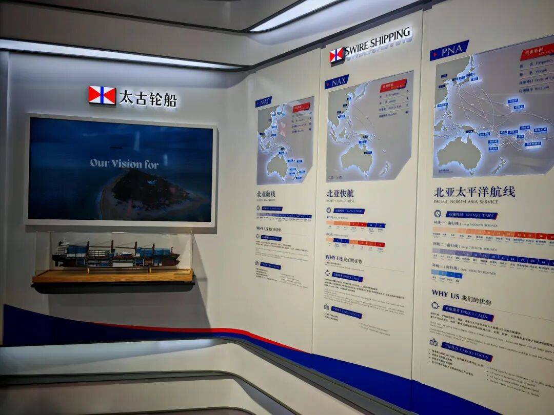 展台工作人员告诉记者,“当前,太古轮船以六条班轮航线连接中国与亚洲其他地区、南太平洋及北美地区,承担集装箱货物、散杂货,以及重型起重和项目货物运输,在中国和太平洋地区提供综合物流解决方案,并通过太古特运提供工程及项目货物运输服务。”