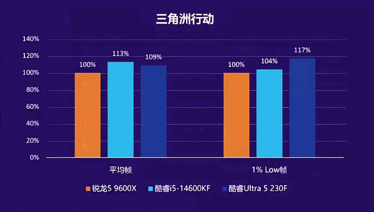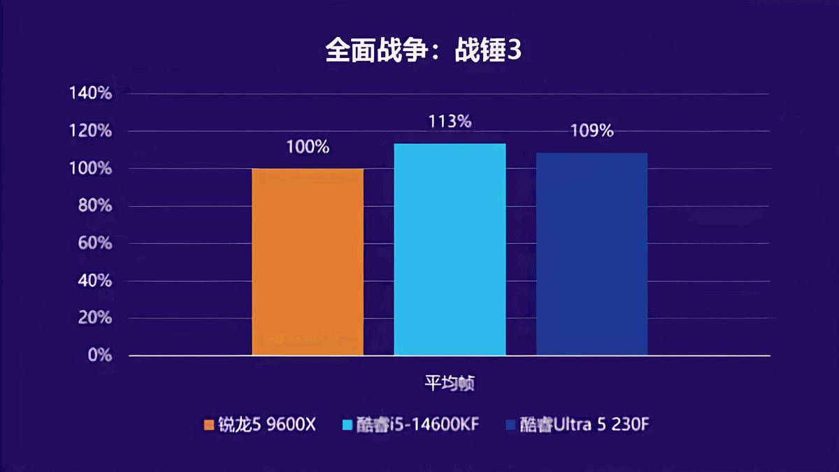 《全面战争:战锤3》的平均帧率,Ultra 5 230F相比于9600X,也处于领先身位。