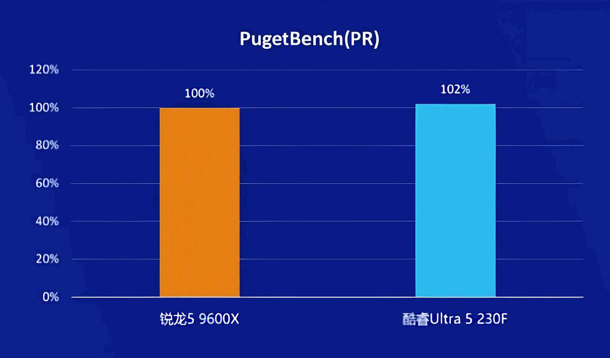 换到更具体的PugetBench(PR)测试,可以看到Ultra 5 230F甚至还有反超的苗头,虽然也是没有拉开差距。总体来说,在生产力方面,两款芯片的实际差别并不明显。