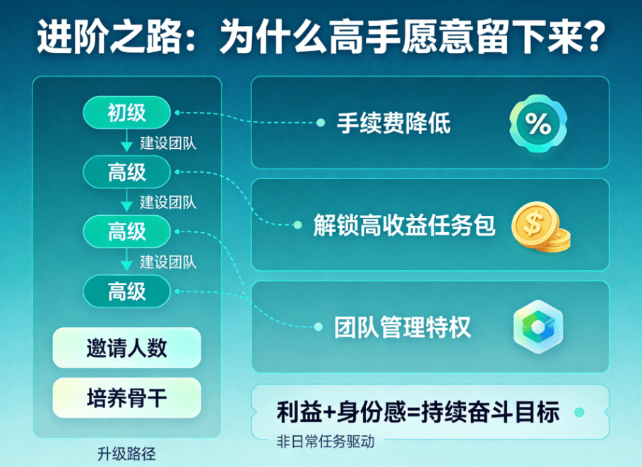 从初级到高级,你需要的不再是简单的活跃,而是建设你的团队。邀请多少人,培养出多少位“骨干”,都有明确指标。每升一级,你的权益也随之提升:手续费降低、能解锁收益更高的任务包、甚至获得团队管理特权。